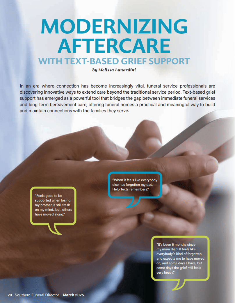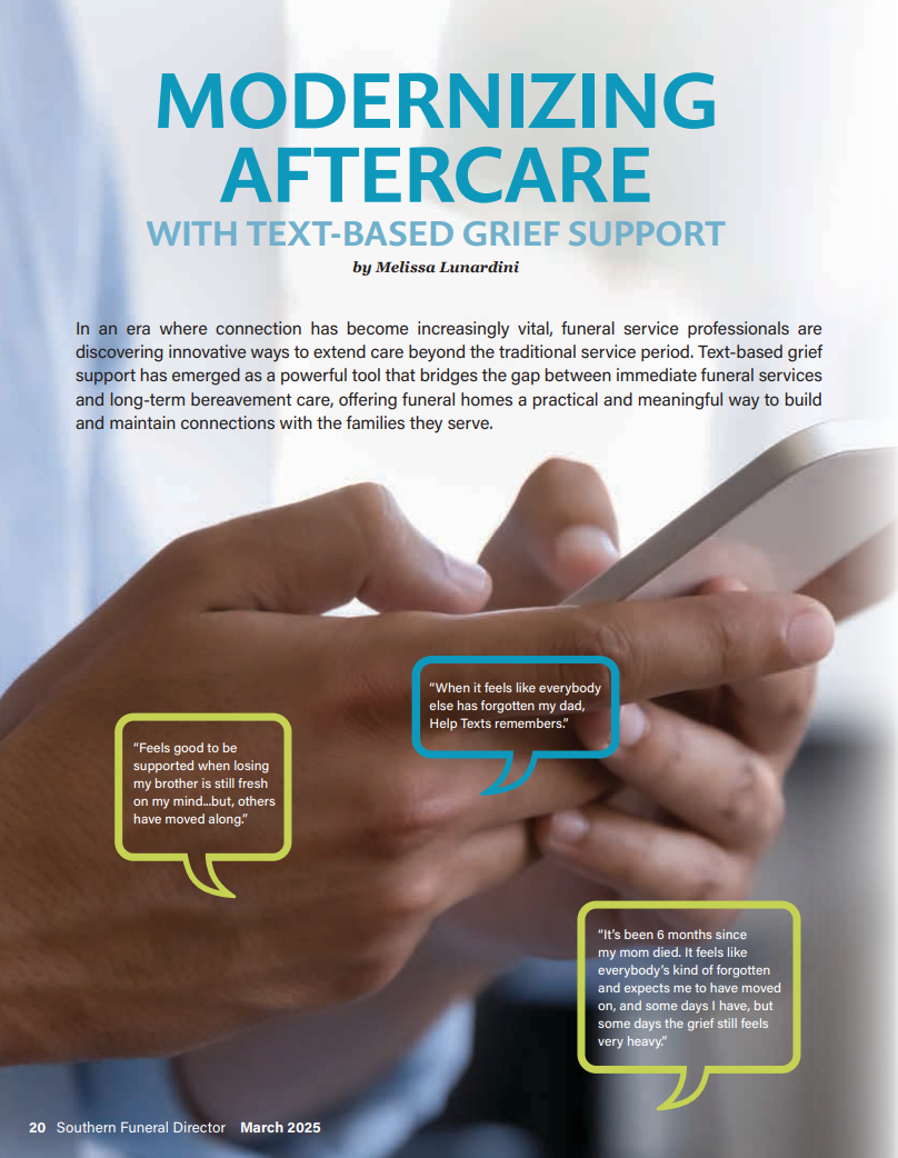 Help Texts' Chief Clinical Officer, Mellisa Lunardini, was featured in Southern Funeral Director Magazine's March 2025 issue! 📱💙 Check out pages 20-23 to read this in-depth article titled "Modernizing Aftercare with Text-Based Grief Support." The article explores how text-based grief support is transforming the way funeral homes provide ongoing care to families. In an industry where meaningful connection is everything, text-based grief support: